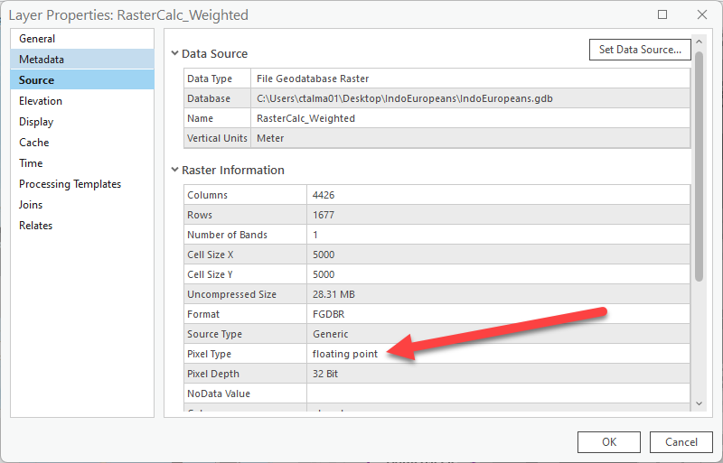 Double click on the weighted raster calculation layer get to it’s properties. Go to the Source tab and expand Raster information. Under Pixel Type, it is listed as a floating point.