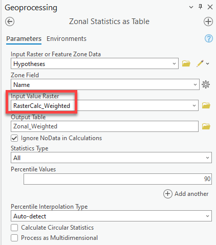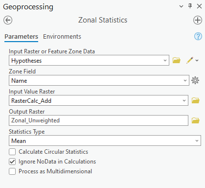 First, we select the “zone” data we want to use – e.g., our polygons of hypotheses—for the “Input raster or Feature Zone Data.”