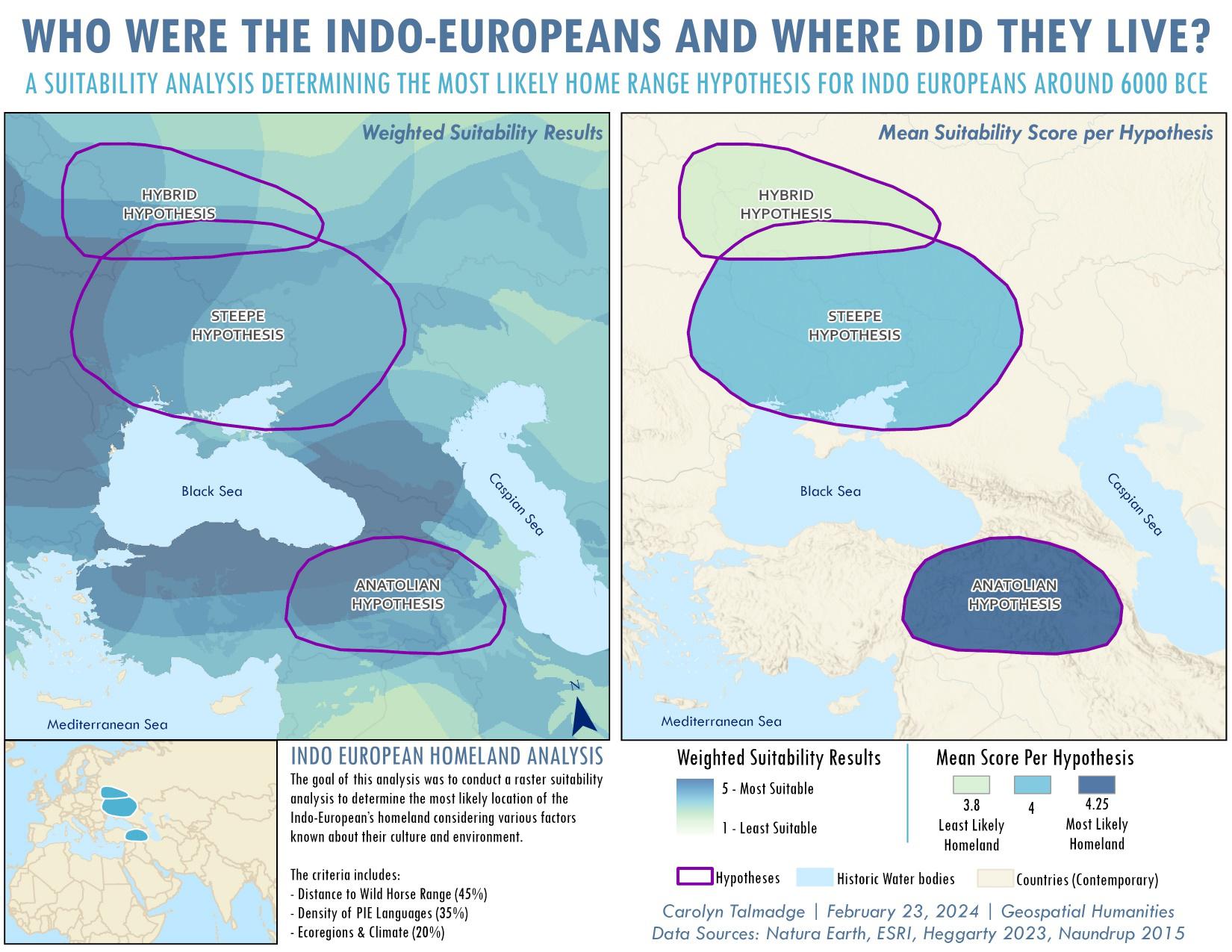 Tutorial Disclaimer: This tutorial is written for educational purposes only to learn GIS raster suitability analysis and should not serve as a source for research on the homeland of Indo Europeans. The tutorial author is not an expert on Indo Europeans and all ranking/scoring of data was based on an educational “best guess” by reading a handful of sources below. These results should not be considered accurate and are meant only as a GIS demonstration* on how to complete a raster suitability analysis for a Geospatial Humanities course at Tufts University.*